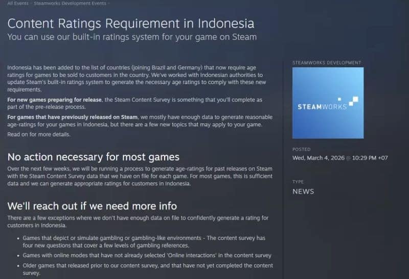 Kini giliran Indonesia yang masuk ke dalam sistem rating wajib di Steam, menyusul Brasil dan Jerman yang lebih dulu menerapkan kebijakan serupa.