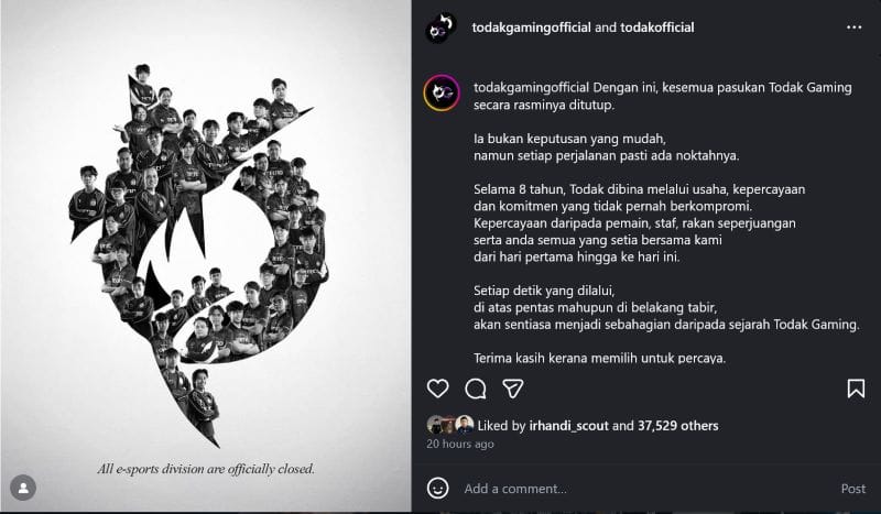 Organisasi esports asal Malaysia, Todak Gaming, resmi mengumumkan pembubaran seluruh divisi esports mereka setelah berkiprah selama delapan tahun. Keputusan ini disampaikan langsung melalui unggahan di akun Instagram resmi Todak dan langsung mengundang reaksi besar dari komunitas esports Asia Tenggara.