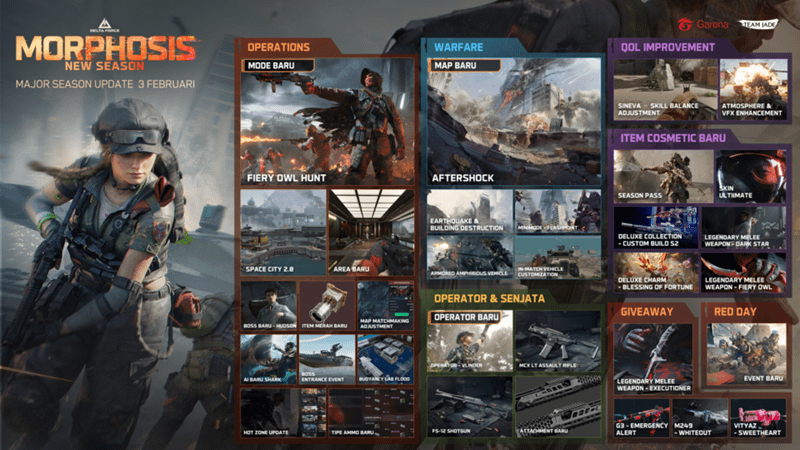 Garena Delta Force resmi membuka tahun 2026 dengan update besar bertajuk Season: Morphosis yang akan mulai dirilis pada 3 Februari 2026. Update ini membawa segudang konten anyar yang siap mengubah dinamika pertempuran, baik untuk pemain PC maupun Mobile.