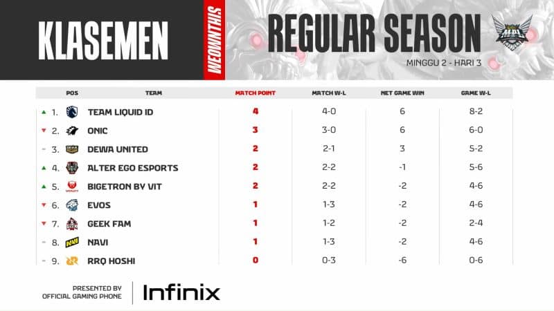 Sebaliknya, RRQ Hoshi masih belum mampu meraih satu kemenangan pun hingga akhir minggu kedua. Situasi ini tentu menjadi alarm bahaya bagi tim berjuluk “Raja” tersebut.