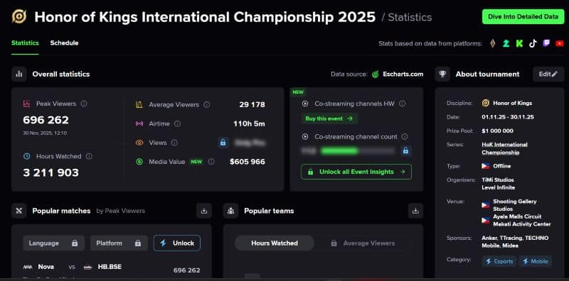 Menurut data resmi, laga final antara Nova Esports dan HomeBois BSE berhasil mencapai 696.262 peak concurrent viewers, menjadikannya event Honor of Kings paling banyak ditonton sepanjang 2025 di ranah internasional.