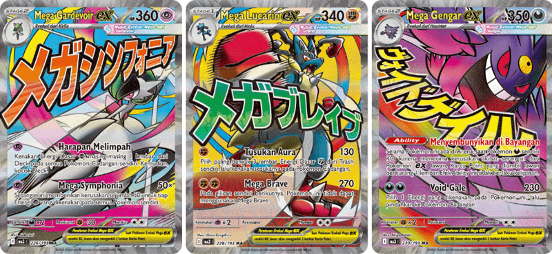 Tak hanya menghadirkan Mega Ultra Rare, seri Evolusi Mega Impian ex juga memperkenalkan tingkat kelangkaan baru bernama Mega Attack Rare (MA). Kartu MA tampil dengan desain pop art yang mencolok, lengkap dengan penulisan nama serangan utama dalam Bahasa Jepang, memberikan kesan unik dan premium.