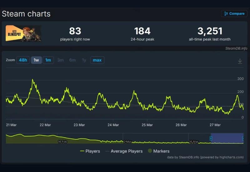 Saat pertama rilis, PUBG: BLINDSPOT sempat mencatat sekitar 3.200 pemain aktif secara bersamaan. Namun angka tersebut terus menurun drastis.