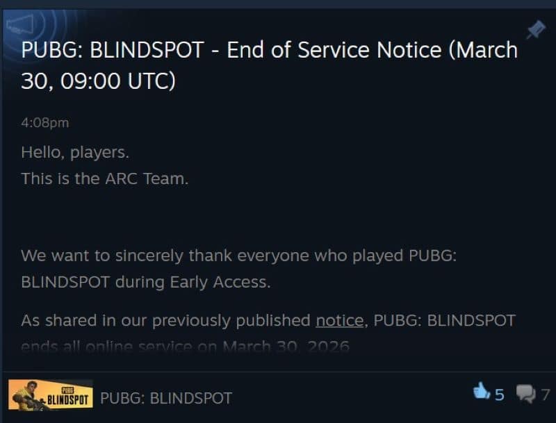 Tanpa roadmap baru atau rencana perbaikan, keputusan penutupan diambil secara langsung. Artinya, PUBG: BLINDSPOT bahkan tidak sempat mencapai usia dua bulan sejak perilisan awalnya.
