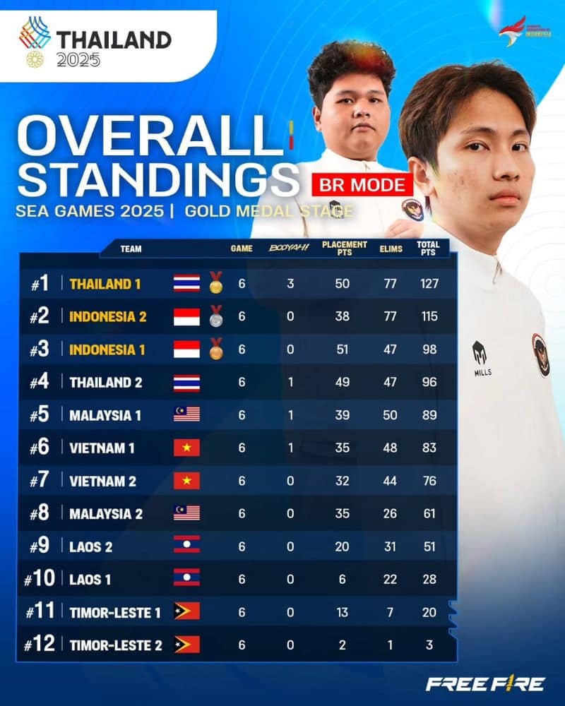 Hasil akhir menempatkan Indonesia di posisi medali perak dan perunggu, sebuah pencapaian besar yang menegaskan kualitas dan kedalaman talenta Free Fire Indonesia di level regional.