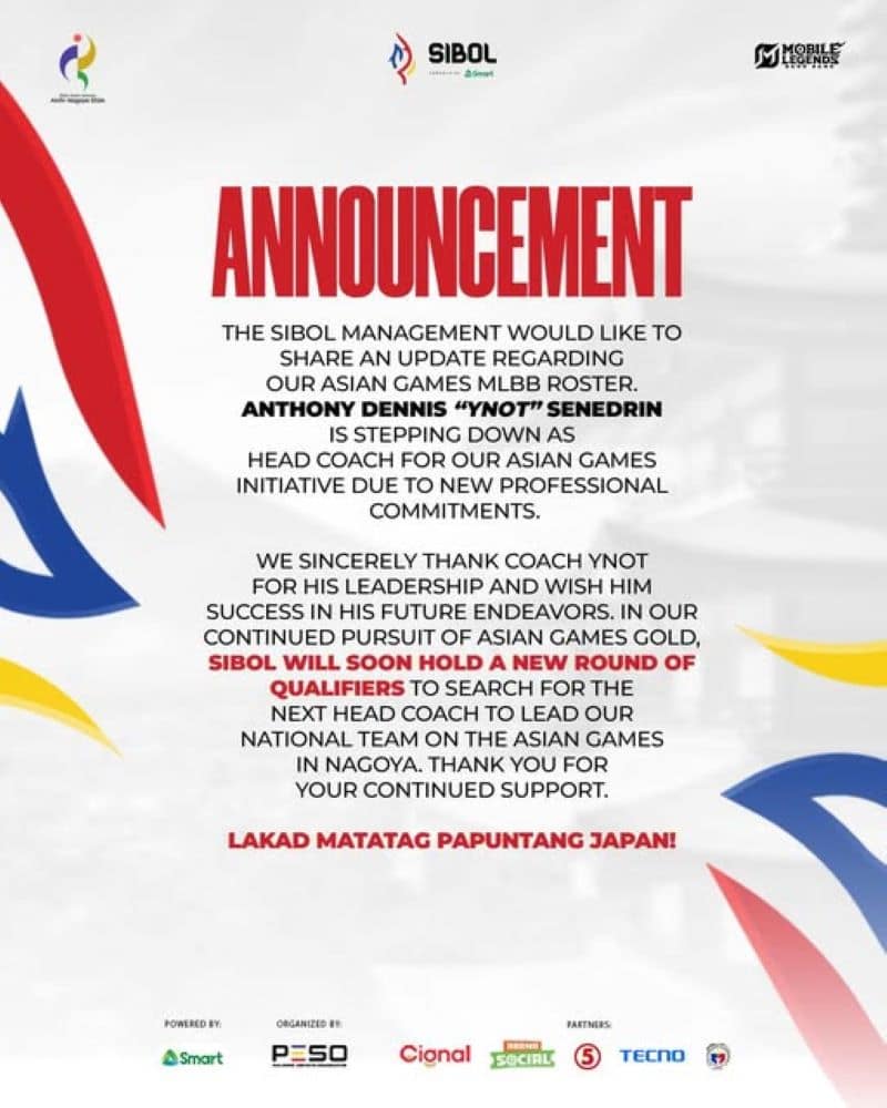 “Manajemen SIBOL ingin menyampaikan pembaruan terkait roster MLBB Asian Games kami. Anthony ‘Ynot’ Senedrin memutuskan untuk mundur dari posisi head coach untuk program Asian Games karena komitmen profesional baru,” tulis SIBOL.